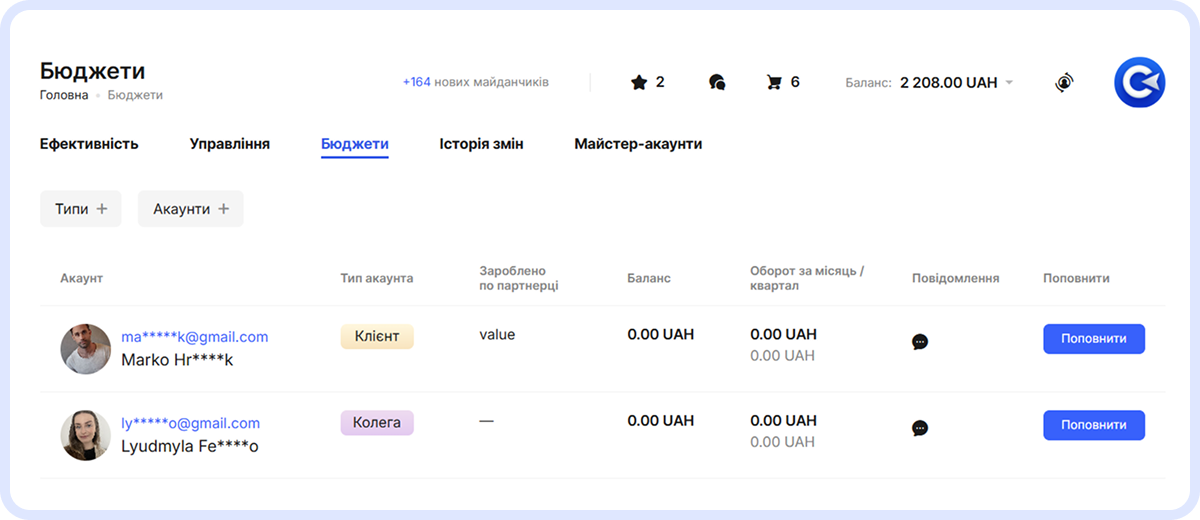 Розділ «Бюджети» в Майстер-акаунті: два акаунти — Колега та Клієнт — із нульовими балансами та кнопками «Поповнити»
