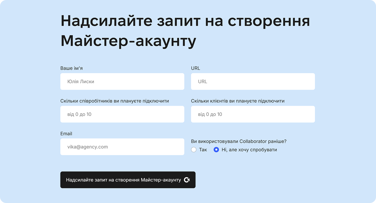 Надішліть запит на створення Майстер-акаунта: заповніть поля, вказавши ім'я, URL-адресу, кількість співробітників, кількість клієнтів, електронну пошту та попередній досвід використання Collaborator